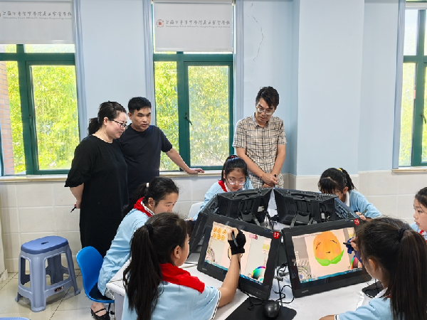 下午在三官堂学校,调研小组先进入课堂观摩了仲敏老师四年级一班美术学科《我给黄桃穿花衣》一课,该课使用了学校动漫室的一体机电脑及电脑绘画软件进行教学活动,并实时打印学生绘画作品进行展示交流,有效激发了学生的学习兴趣并提升了课堂师生互动,生生互动的有效性。接着听取了信息化分管领导翁岚佳对学校信息化工作的汇报。调研小组对学校信息化工作给予总体认可的同时,建议学校更好的利用三个助手的相关平台和工具提高课堂质效;更加积极地参加区域和市域的各类比赛;王冬欢老师对学校新建成的图书馆的布置等谈了有关想法,并建议学校更加积极地参与“我爱上海读书”,“暑期读书活动”等市和区级相关征文活动。